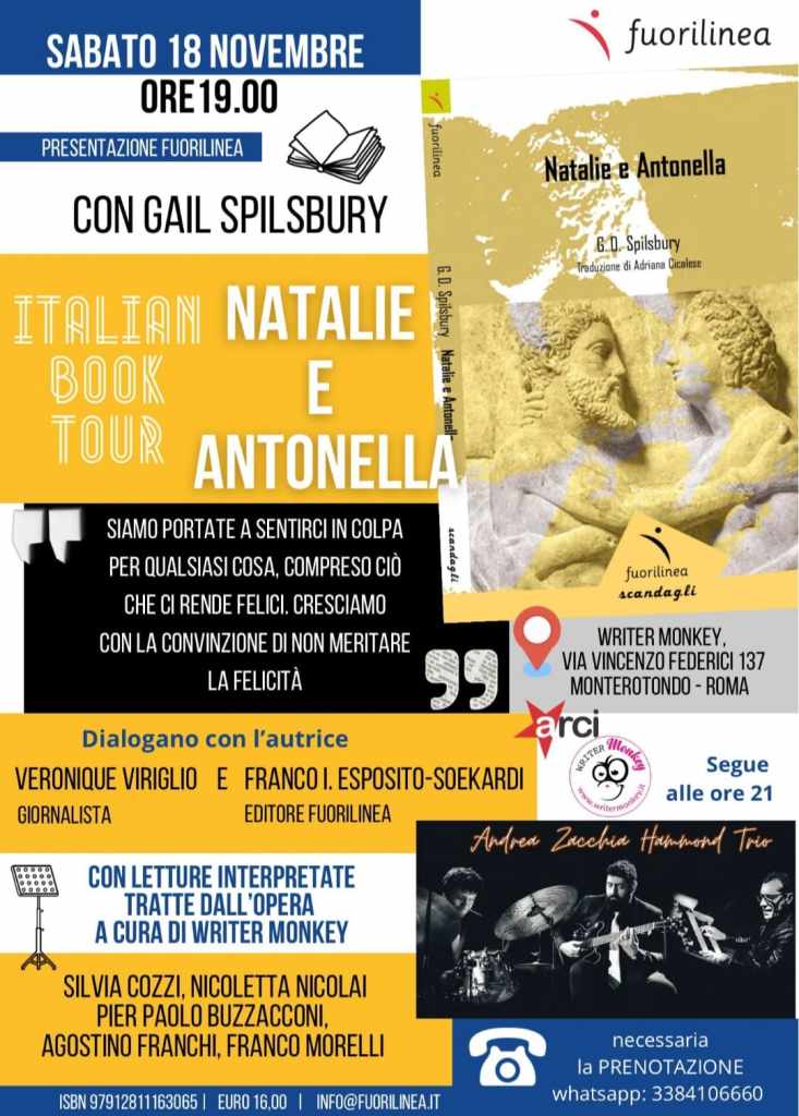 Prima del concerto, alle ore 19.00, Gail Spilsbury presenterà il libro “Natalie e Antonella”, insieme a Veronique Virgilio e Franco I.Esposito – Soekardi, con letture interpretate da Silvia Cozzi, Nicoletta Nicolai, Pier Paolo Buzzacconi, Agostino Franchi e Franco Morelli.