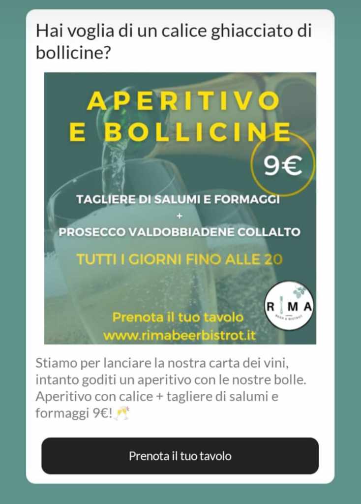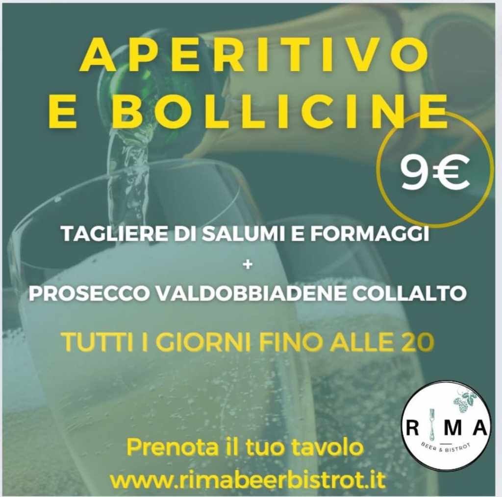 Non lasciatevi sfuggire l’opportunità di vivere l’evento “Aperitivo e Bollicine” e di lasciarvi conquistare dalla perfetta armonia di sapori e atmosfere al Rima Beer&Bistrot.