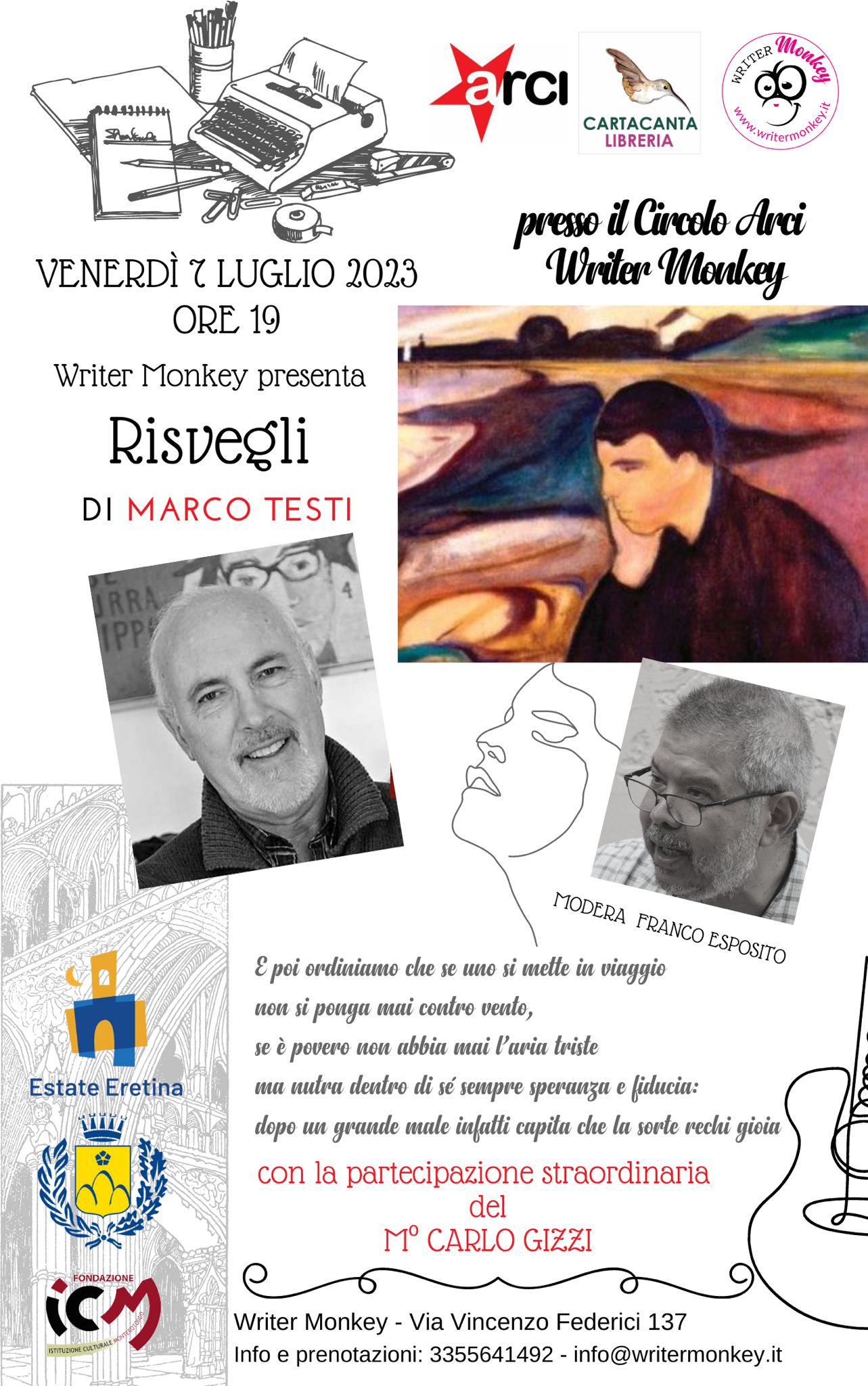 Venerdì 7 Luglio alle ore 19.00, gli appassionati di letteratura avranno l’opportunità di immergersi in una bellissima avventura letteraria, presso il Circolo Culturale Writer Monkey, in Via Vincenzo Federici 137 a Monterotondo, dove si terrà un evento la presentazione del libro “Risvegli” dello scrittore Marco Testi.