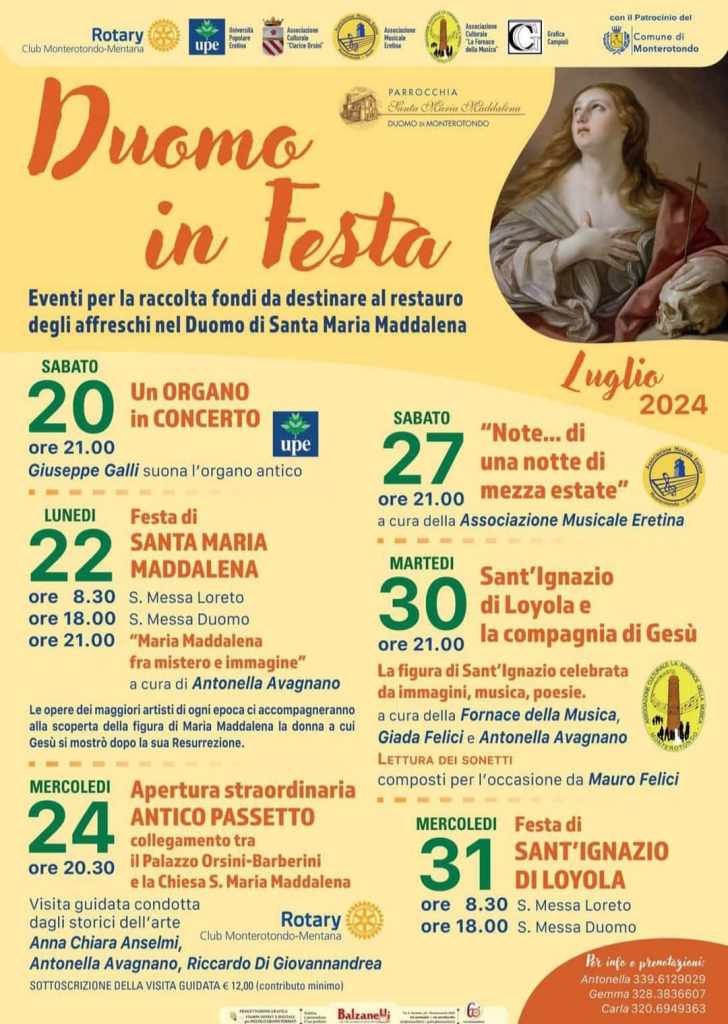 Il Comune di Monterotondo annuncia l’inizio di “Duomo in Festa” sabato 20 luglio. Questo evento culturale, che durerà una settimana, ha lo scopo di raccogliere fondi per il restauro degli affreschi nel Duomo di Santa Maria Maddalena.