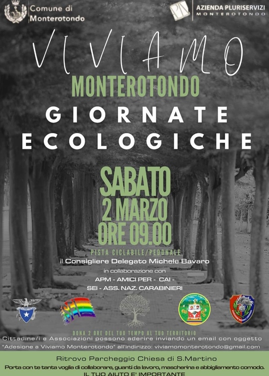 Sabato 2 marzo, alle ore 9.00, si terrà un’importante iniziativa volta a promuovere la cura e la pulizia del territorio locale. Organizzato dal Sindaco Riccardo Varone insieme a Michele Bavaro e con la partecipazione della Sezione di Monterotondo del Club Alpino Italiano e dell’Associazione Nazionale Carabinieri di Monterotondo, l’evento prevede la pulizia della pista ciclabile.