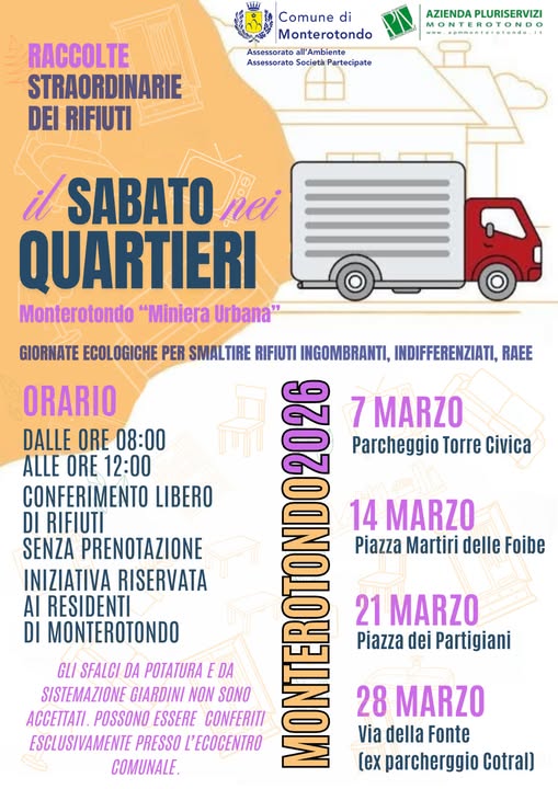 Riparte a Monterotondo l’iniziativa “Il sabato nei quartieri”, il calendario di raccolte straordinarie dei rifiuti organizzato nel territorio comunale.