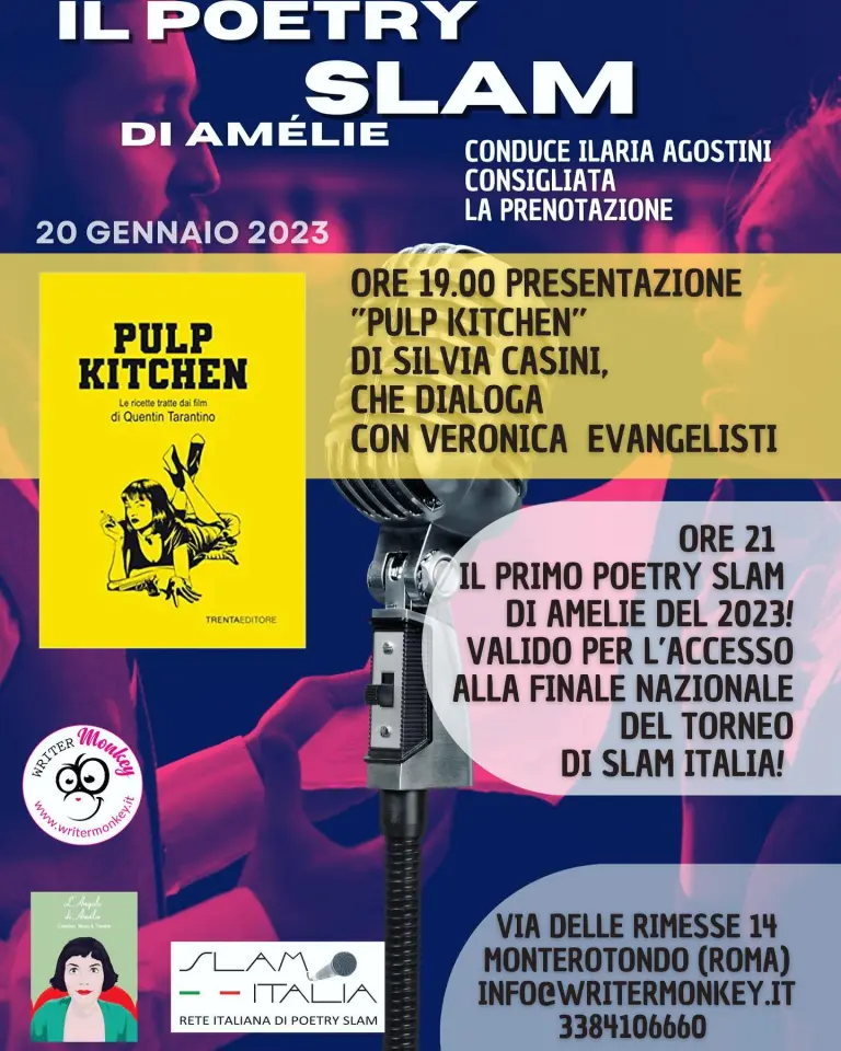 L’evento Poetry slam è organizzato da Writer Monkey presso l’Angolo di Amélie a Monterotondo, in provincia di Roma.