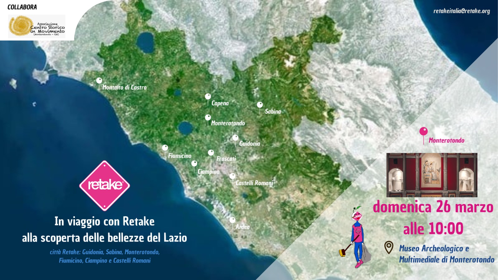 Questa seconda tappa vede Monterotondo e il suo Museo Archeologico e Multimediale come protagonisti, e sarà un onore per Retake Monterotondo e per l’Associazione Centro Storico in Movimento far conoscere a tanti cittadini di altre città Laziali (Roma, Guidonia, Montecelio, Ciampino, Fiumicino, Castelli Romani, Frascati, Sabina) alcune delle nostre bellezze.