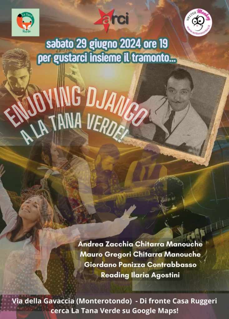 La Tana Verde di Monterotondo in collaborazione con Writer Monkey, si prepara ad ospitare una serata jazz unica, il 29 giugno alle ore 19:00, dove il tramonto farà da sfondo ideale per il tributo a Django Reinhardt, una leggenda del jazz manouche. Dopo il successo straordinario del concerto di aprile al circolo Writer Monkey, l’evento si preannuncia come un altro appuntamento imperdibile per gli amanti della musica e della storia del jazz.