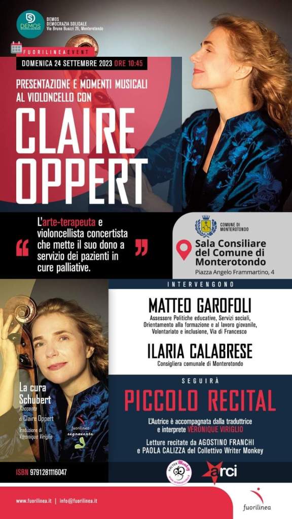 Domenica 24 Settembre alle 10.45, il Comune di Monterotondo sarà pervaso da un’atmosfera magica grazie alla straordinaria violoncellista Claire Oppert. L’evento avrà luogo nella Sala Consiliare, in Piazza Angelo Frammartino 4, e vedrà la partecipazione di Matteo Garofoli, Assessore ai Servizi Sociali, e la consigliera comunale, Ilaria Calabrese, mentre Veronique Viriglio svolgerà il ruolo di interprete e traduttrice.