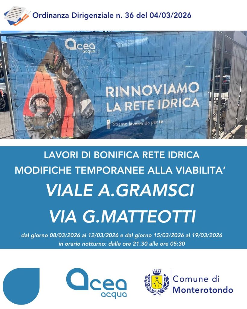 Il Comune di Monterotondo ha emesso l’ordinanza dirigenziale n. 36 del 4 marzo 2026 per consentire lo svolgimento dei lavori di bonifica della rete idrica tra viale Antonio Gramsci e via Giacomo Matteotti.