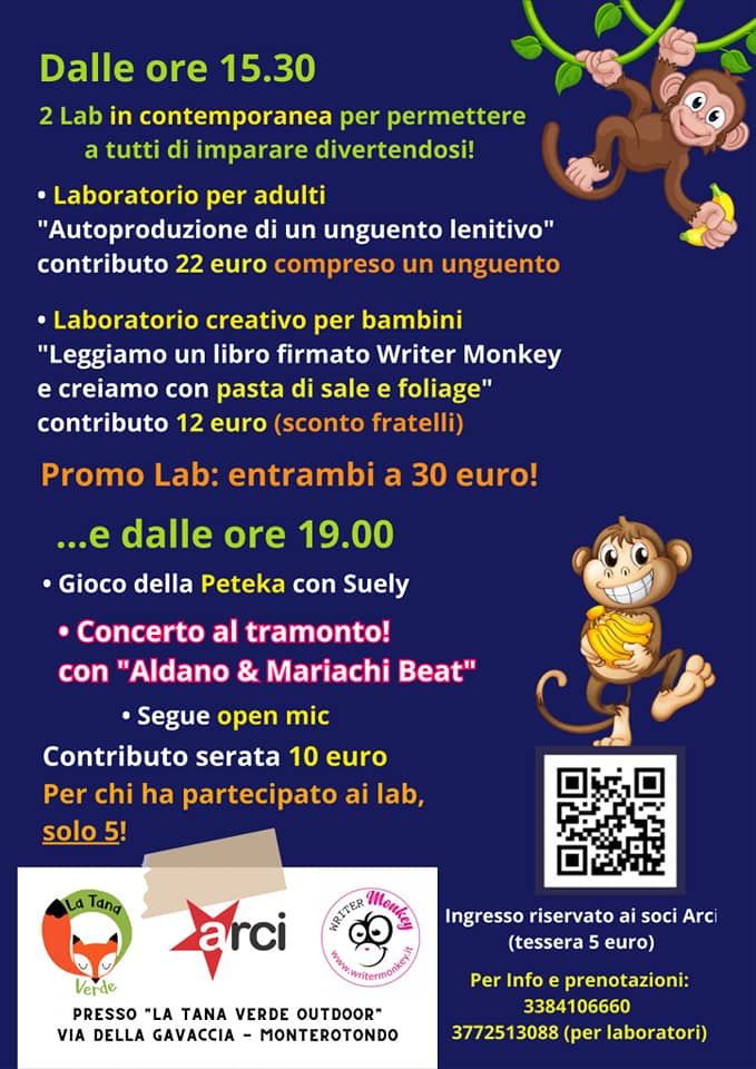 Sabato 10 giugno si terrà un evento speciale chiamato “Monkey Fiesta” presso La Tana Verde a Monterotondo, che promette di offrire un’esperienza divertente e coinvolgente per persone di tutte le età. L’evento inizierà alle 15.30 e si protrarrà fino a tarda sera, offrendo una varietà di attività interessanti per i partecipanti.