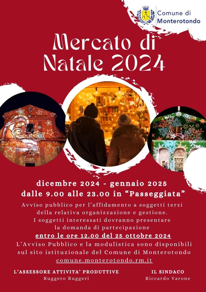 Il Comune di Monterotondo ha annunciato l’organizzazione del Mercato di Natale 2024, che si terrà lungo la “Passeggiata V. Nobili” tra dicembre 2024 e la prima settimana di gennaio 2025, dalle 9:00 alle 23:00.