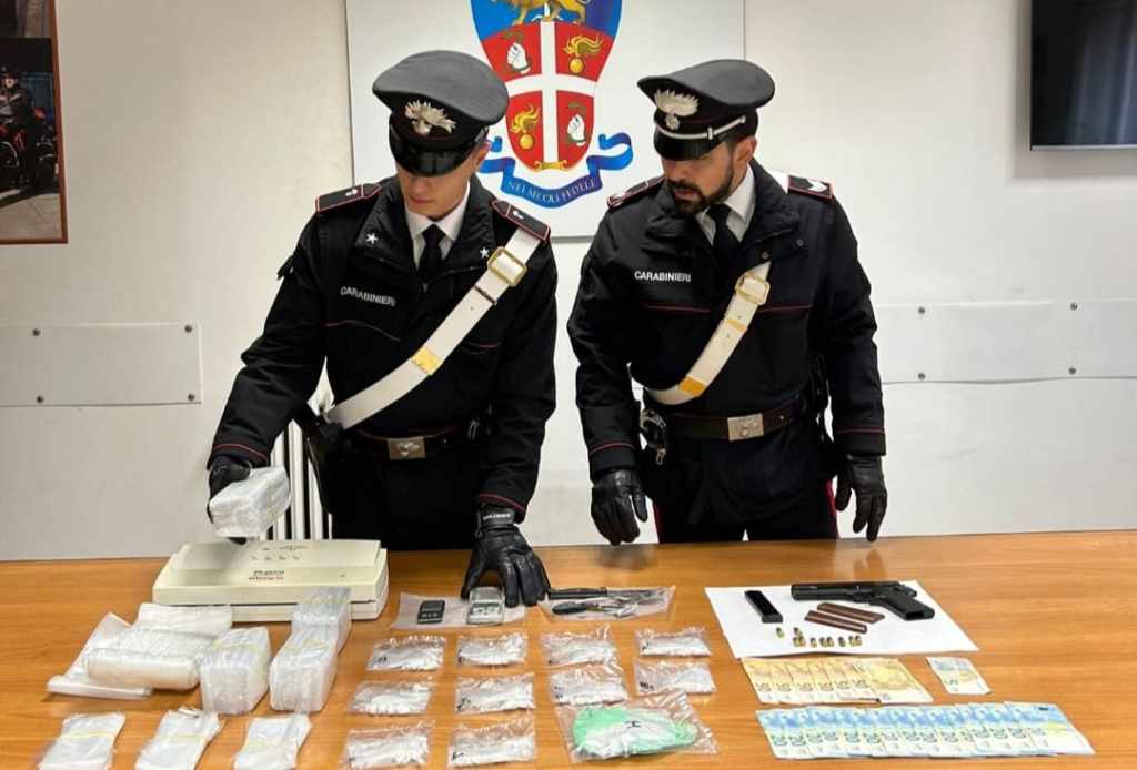 Gli ulteriori accertamenti presso l’abitazione dell’uomo hanno consentito di rinvenire un cospicuo quantitativo di materiale per il confezionamento, nonché una pistola a salve, 2 proiettili e 8 bossoli cal. 380.