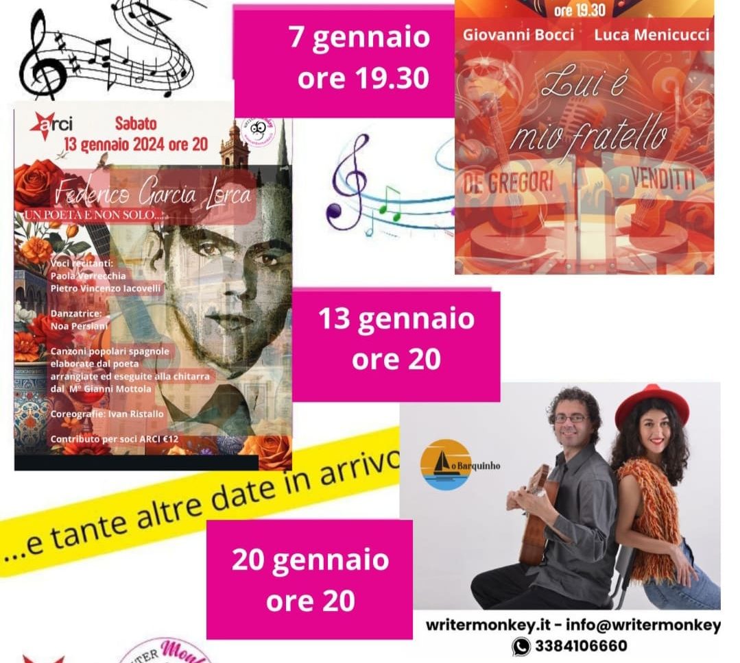 Questo gennaio, il circolo ARCI Writer Monkey di Monterotondo sarà di nuovo cornice di un trittico di serate indimenticabili e variegate, ospitando un programma di concerti che spaziano dalla poesia musicale alla passione iberica, fino ad arrivare alle sonorità accattivanti del duo Barquinho.