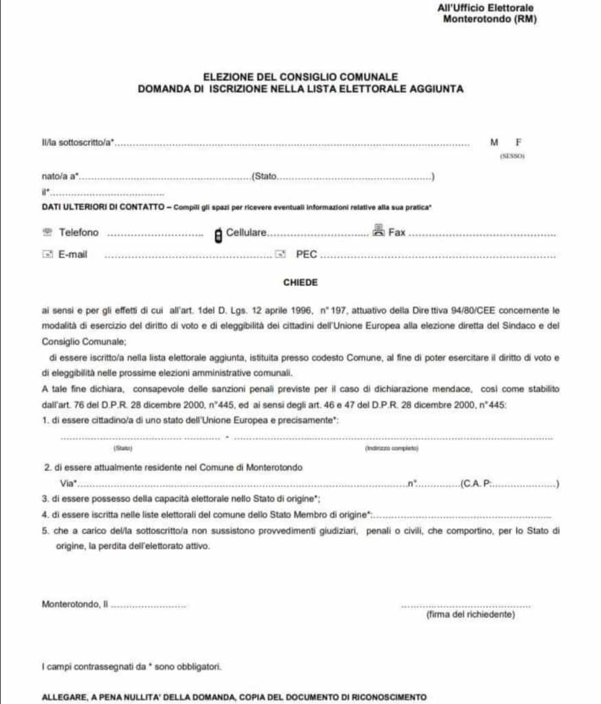 I cittadini degli Stati membri dell’Unione europea residenti in Italia hanno il diritto di partecipare alle elezioni comunali e circoscrizionali di Monterotondo. Questo diritto può essere esercitato presentando una domanda per l’iscrizione alla lista elettorale aggiunta presso il Comune di residenza.