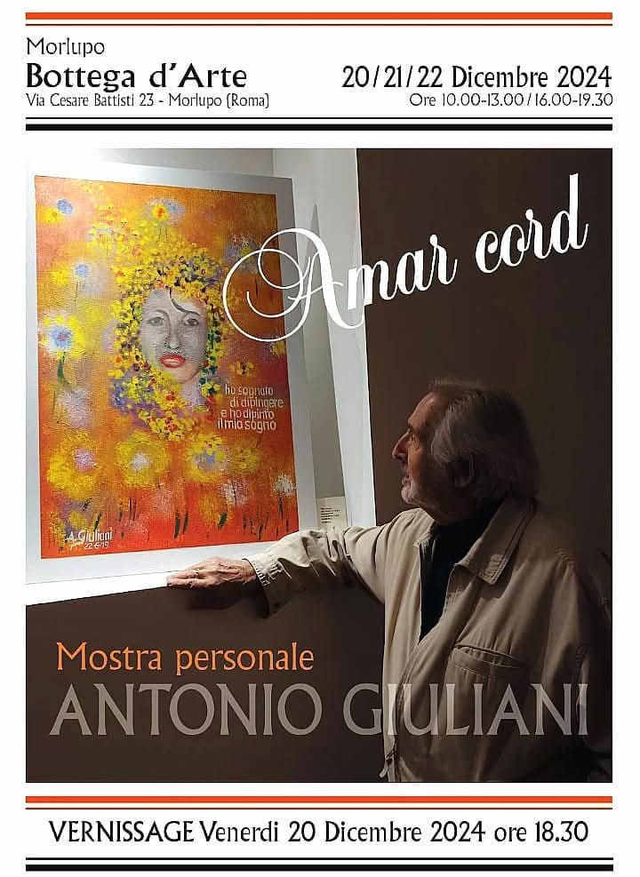 Da venerdì 20 a domenica 22 dicembre la splendida sala espositiva della Bottega d’Arte di Morlupo, in Via Cesare Battisti 23, ospita la Mostra “Amar Cord” del pittore Antonio Giuliani.