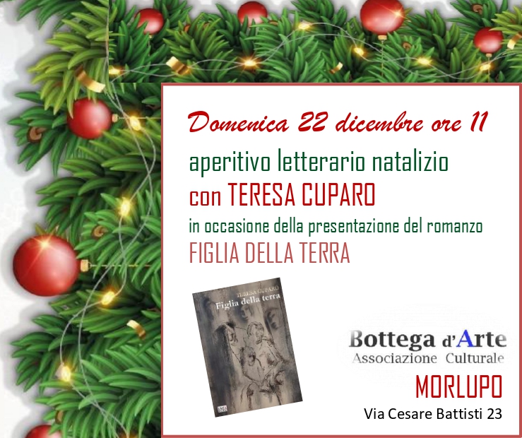 Domenica 22 dicembre a Morlupo, presso l’Associazione culturale Bottega d’Arte, alle ore 11, si terrà un aperitivo letterario natalizio con Teresa Cuparo, che presenterà il suo nuovo romanzo “Figlia della terra”, edito da Emia edizioni. Un romanzo che è un viaggio nel tempo e che rappresenta un inno alla vita, decantata in maniera passata, presente e futura.