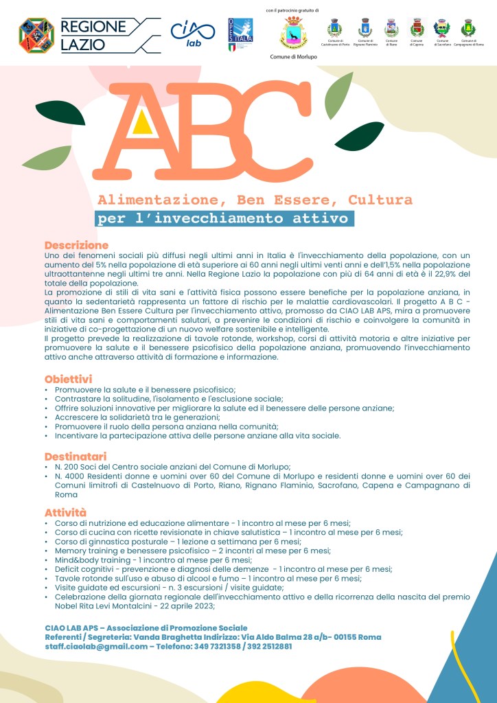 L’invecchiamento è un processo naturale della vita che tutti dobbiamo affrontare. Tuttavia, ci sono molte cose che possiamo fare per garantire che l’invecchiamento sia attivo e soddisfacente. Il progetto Nuovo Progetto di CIAO LAB APS, finanziato dalla Regione Lazio, si concentra sull’Alimentazione, il Benessere e la Cultura per l’invecchiamento attivo, con l’obiettivo di promuovere stili di vita sani e comportamenti salutari tra gli anziani.
