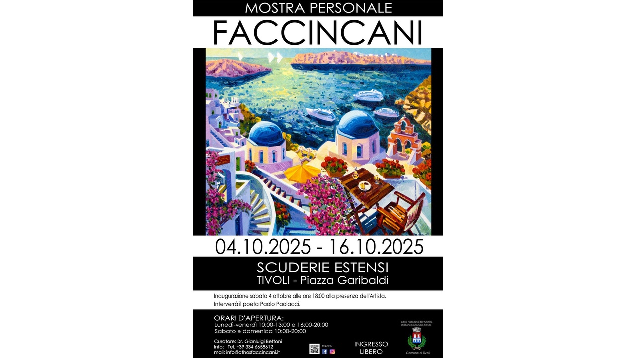 Il Maestro Athos Faccincani, dopo numerose esposizioni in Italia e all’estero, approda a Tivoli con una nuova mostra personale che si terrà alle Scuderie Estensi dal 4 al 16 ottobre 2025.