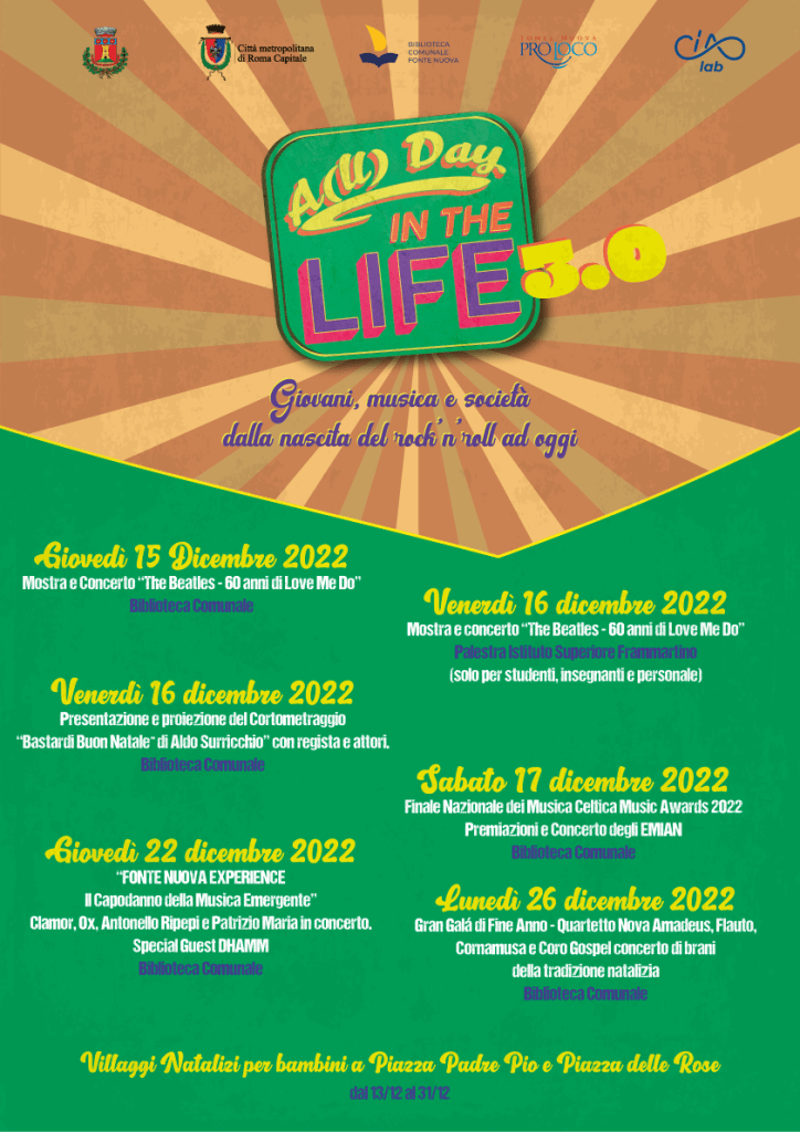 Dopo la pausa forzata dovuto alla pandemia, torna il Natale a Fonte Nuova, nel format che negli ultimi anni ha avuto maggior successo: A(ll) day in the life 3.0, una rassegna di musica, cultura, cinema e animazione per i più piccoli.
