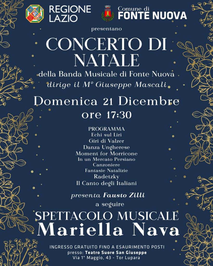 La Banda Musicale di Fonte Nuova si esibirà sotto la direzione del maestro Giuseppe Mascali, con la conduzione di Fausto Zilli, proponendo un repertorio pensato per celebrare il Natale attraverso la musica e creare un’atmosfera di partecipazione e condivisione. A impreziosire ulteriormente la serata sarà, a seguire, lo spettacolo musicale di Mariella Nava, artista di grande sensibilità e riconosciuto prestigio nel panorama musicale italiano, capace di coniugare intensità emotiva e qualità interpretativa. La sua presenza conferirà all’evento un valore aggiunto, rendendo il concerto non solo un appuntamento musicale, ma anche un’occasione culturale di rilievo per l’intera comunità. L’ingresso è gratuito fino a esaurimento posti.