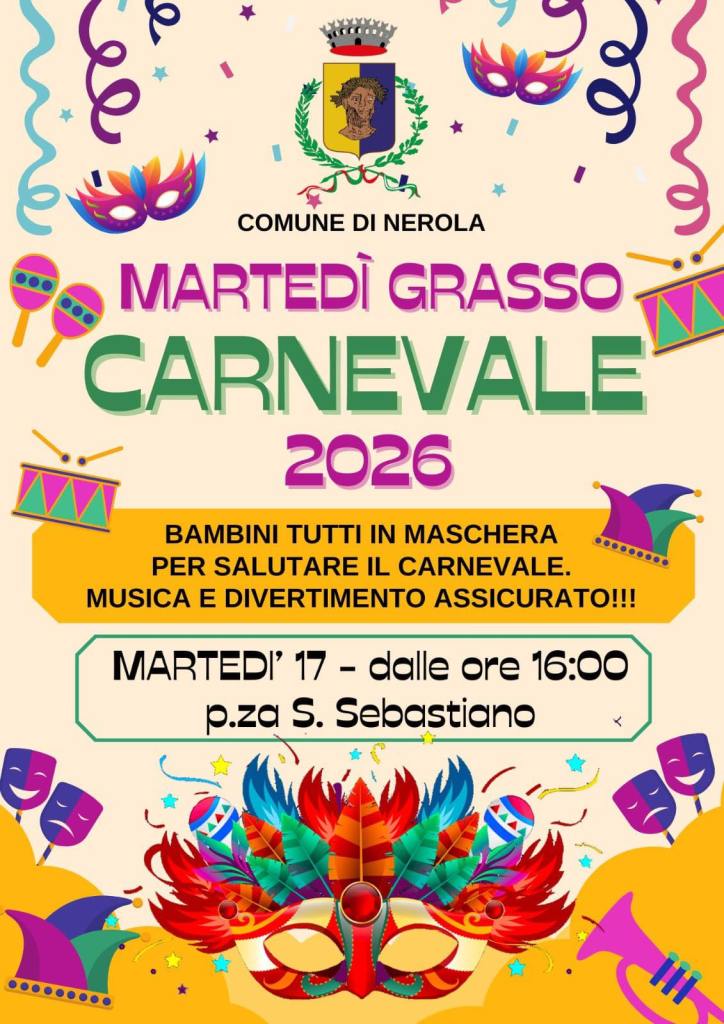 Il Comune di Nerola organizza un pomeriggio di festa in occasione del Carnevale 2026, invitando grandi e piccoli a partecipare agli eventi in programma per il Martedì Grasso.