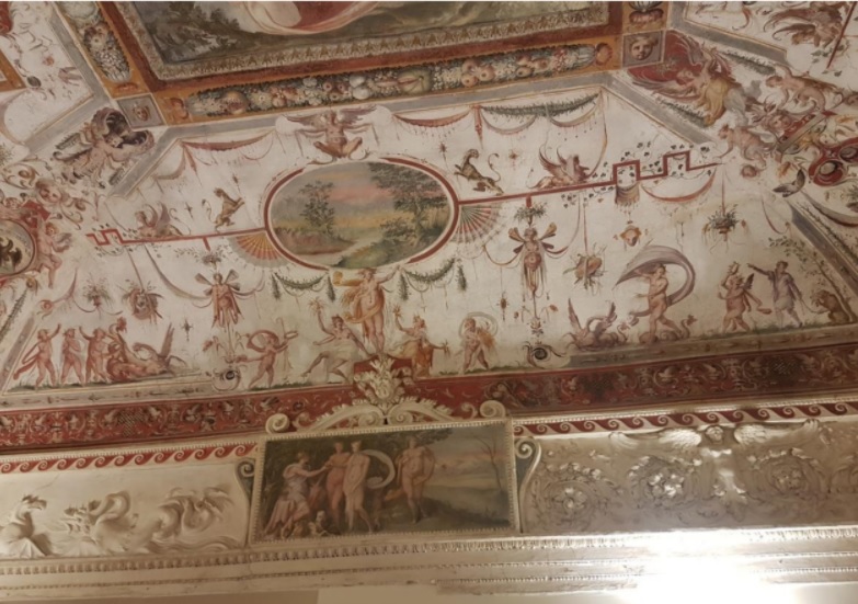 Anche qui il soffitto è riccamente decorato da grottesche. Sono raffigurati animali, fiori, piante, ninfe, putti/angeli e  creature ibride. Lo sfondo delle grottesche è il bianco e anche qui i colori sono vivaci e lo stato di conservazione sembra migliore rispetto all’androne.