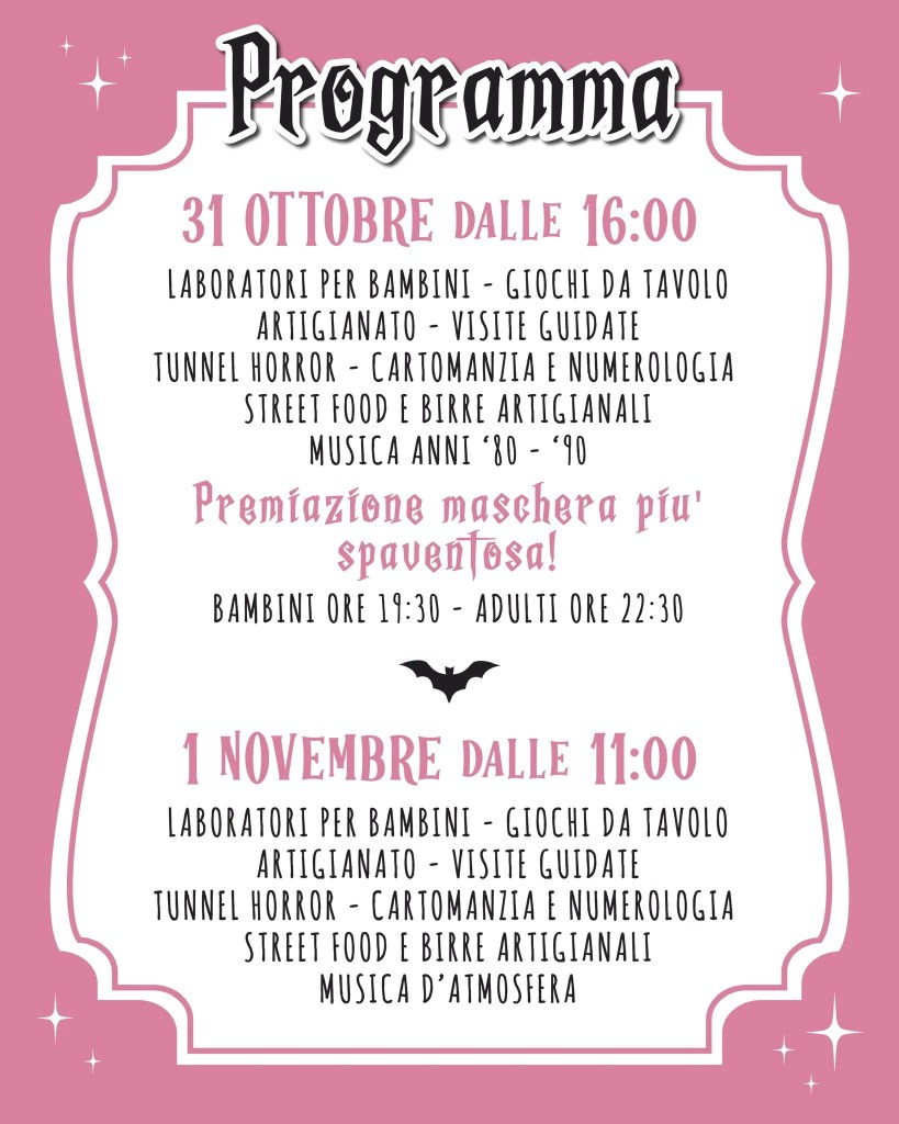 Durante tutta la giornata, le visite guidate permetteranno ai partecipanti di scoprire i segreti nascosti del castello, mentre giochi da tavolo offriranno momenti di svago. La giornata culminerà con una gara di maschere spaventose, aperta a grandi e piccini, per decretare il travestimento più terrificante.