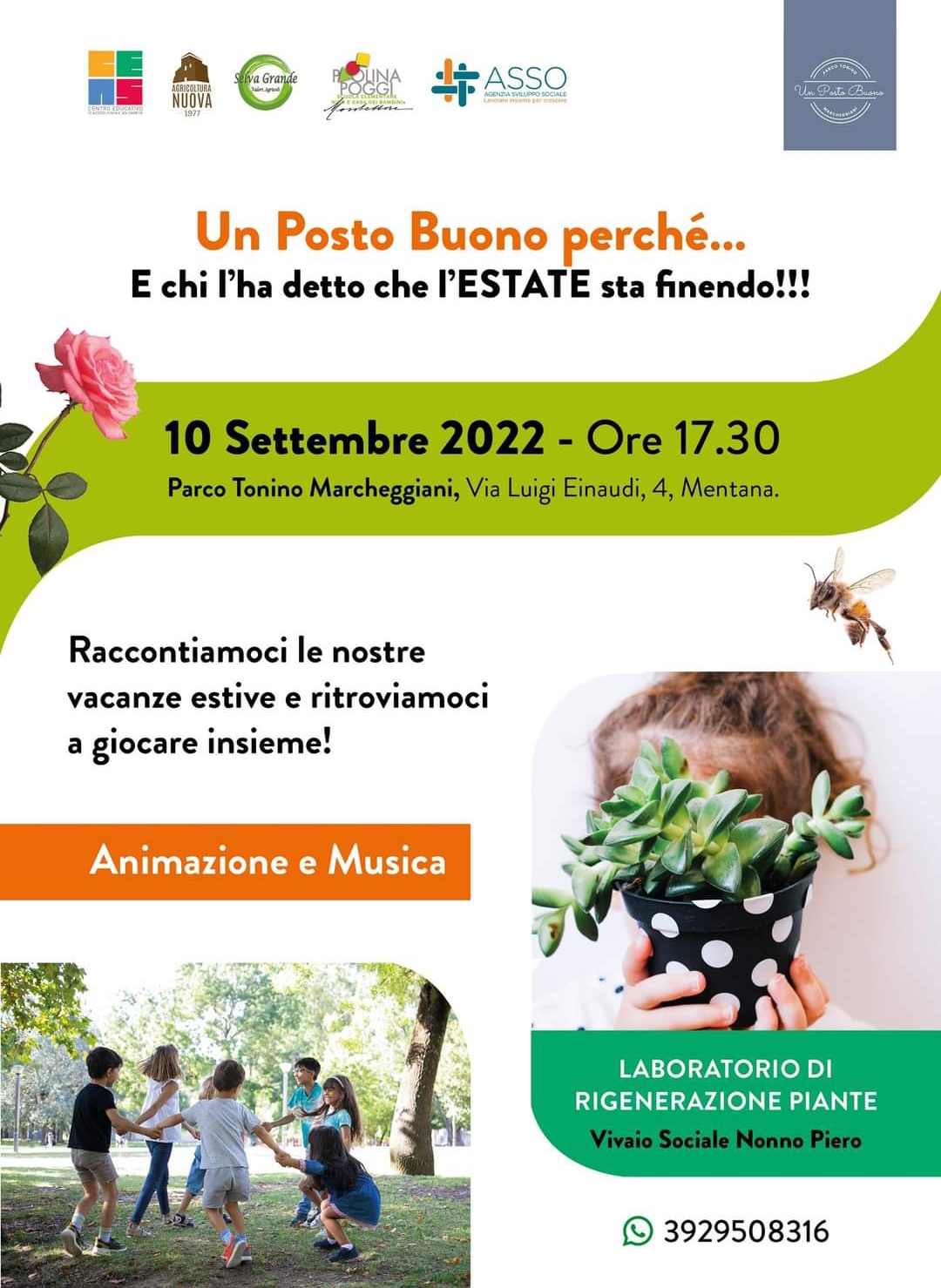 Oggi sabato 10 settembre si terrà l’evento di fine estate al Parco Tonino Marcheggiani di Mentana (RM). ANIMAZIONE, musica e laboratorio di rigenerazione piante in via Luigi Einaudi 4.