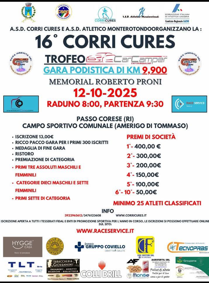 Domenica 12 ottobre 2025 a Passo Corese torna la 16ª edizione della corsa podistica Corri Cures – Trofeo Car-Camper – Memorial Roberto Proni, evento diventato un classico del podismo regionale. La gara di 10 km è organizzata dall’ASD Corri Cures in collaborazione con l’ASD Atletico Monterotondo e con il patrocinio dell’Assessorato allo Sport della Città di Fara in Sabina.