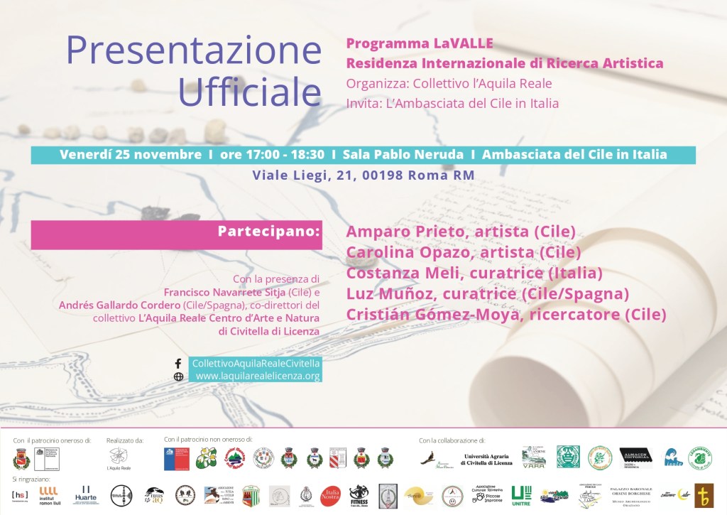 Venerdi 25 Novembre alle ore 17.30, presso l’Ambasciata del Cile a Roma, in Viale Liegi 21, Sala Pablo Neruda, ci sarà la Presentazione del Programma Internazionale di Ricerca Artistica organizzato dal Collettivo Aquila Reale di Licenza e Ambasciata del Cile