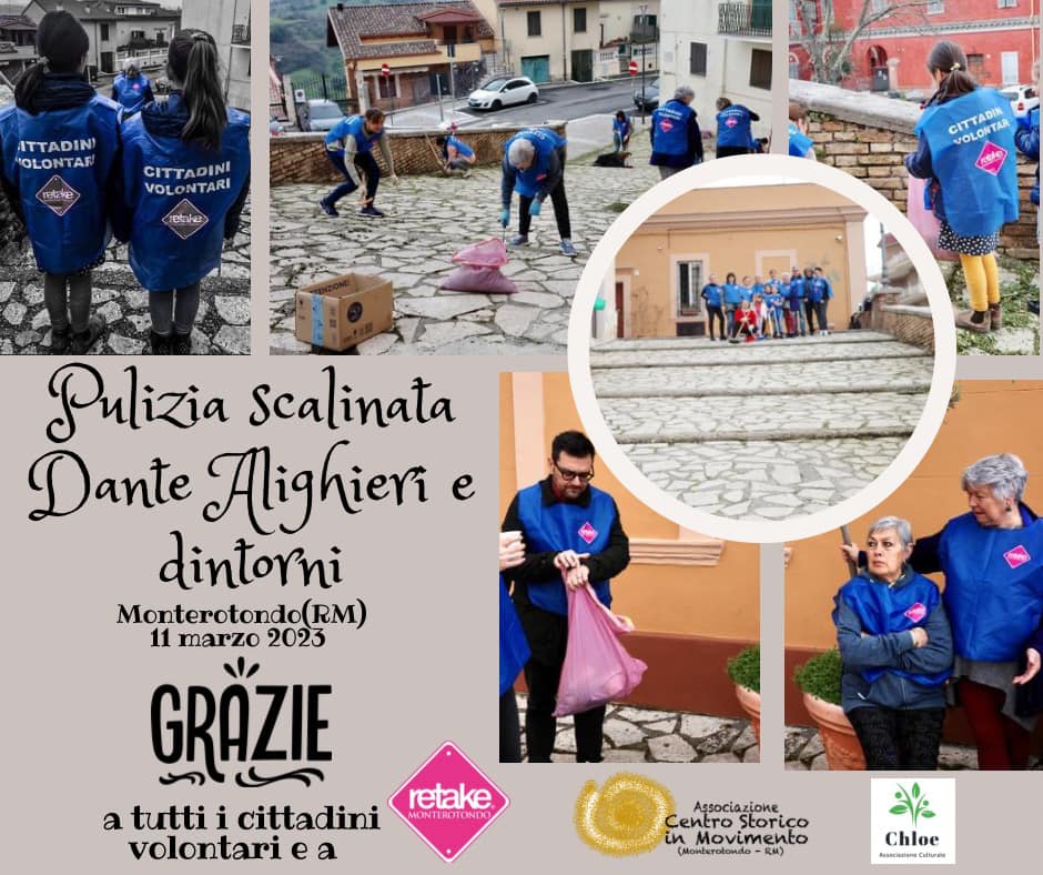 Nella mattinata di Sabato 11 Marzo, a Monterotondo, nel cuore del centro storico del Comune Eretino, si è svolta la pulizia e la rimozione delle erbacce presso la Scalinata di Via Dante Alighieri, evento che ha unito tre Associazioni che, da tempo, hanno a cura il nostro territorio, Retake Monterotondo, Associazione Centro Storico in Movimento, e Chloe Associazione Culturale.