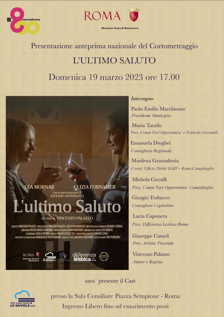 Domenica 19 Marzo alle ore 17.00, a Roma, presso la Sala Consiliare del Municipio III di Roma Capitale, ci sarà la presentazione nazionale del cortometraggio “L’ultimo saluto” del regista Vincenzo Palazzo, con le attrici Lea Mornar e Clizia Fornasier.