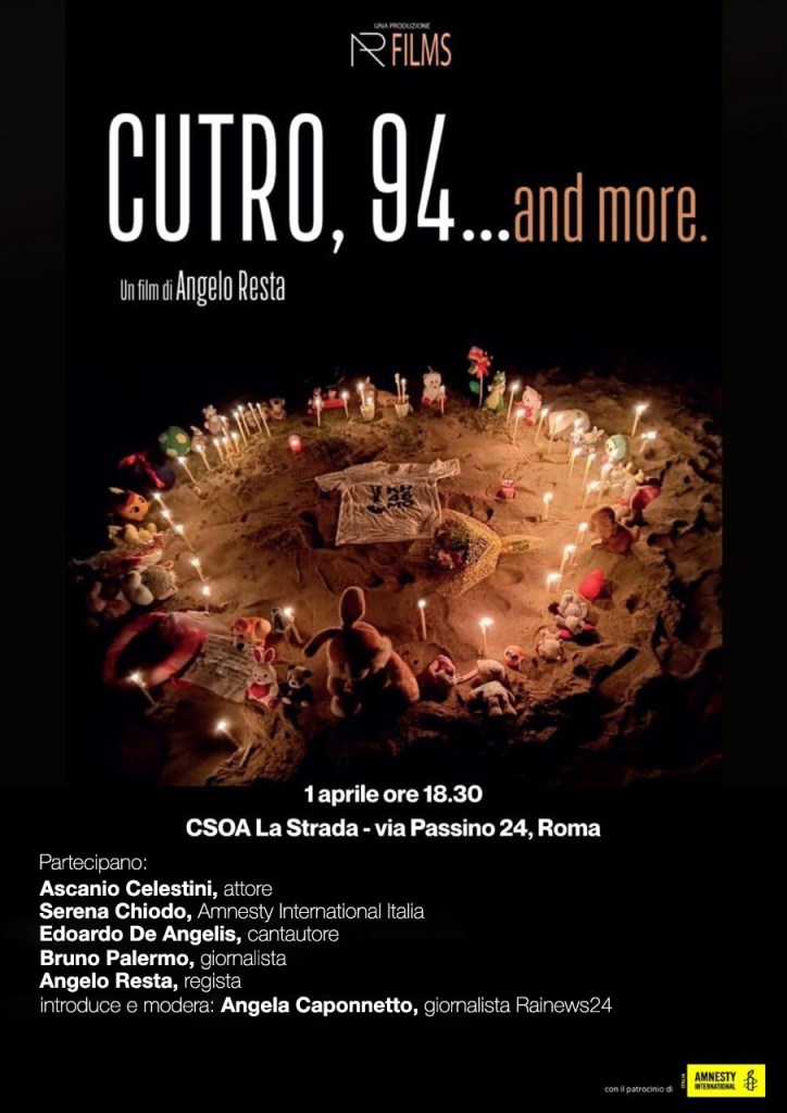 Si terrà mercoledì 1° aprile, dalle ore 18.30 alle 20, al Centro sociale La Strada di Roma, in via Francesco Passini 24 nel quartiere Garbatella, la presentazione del documentario “Cutro, 94… and more” del regista Angelo Resta. L’ingresso sarà libero fino a esaurimento posti.