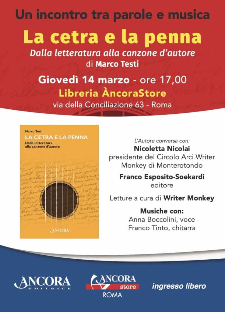 L’appassionante connubio tra musica e parole prenderà vita giovedì 14 marzo alle ore 17.00 presso la rinomata libreria AncoraStore, in Via della Conciliazione 63. Un evento imperdibile che vedrà l’autore Marco Testi presentare il suo ultimo libro intitolato “La Cetra e la Penna“.