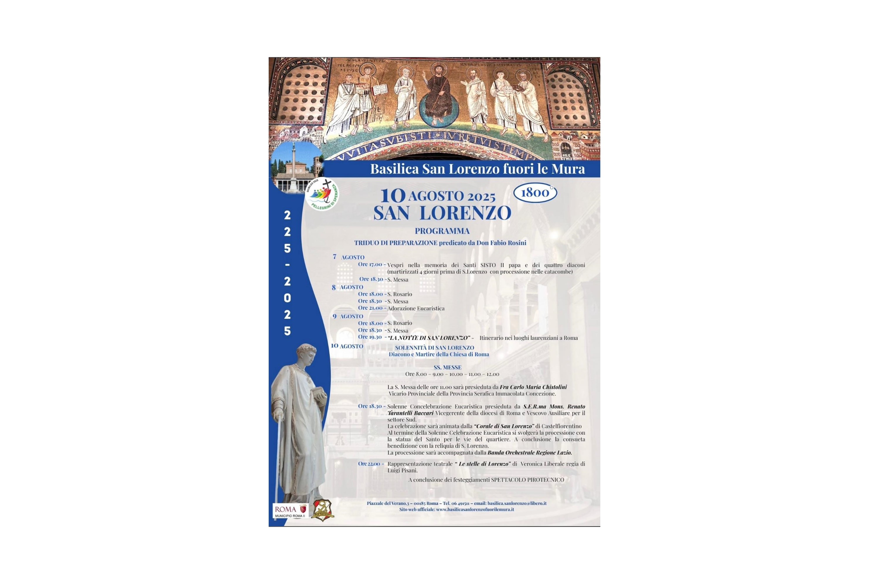 Il prossimo 10 agosto 2025, la Basilica di San Lorenzo fuori le Mura accoglierà centinaia di fedeli per la Solennità di San Lorenzo, diacono e martire della Chiesa di Roma, nel giorno che segna il 1800° anniversario del suo martirio.