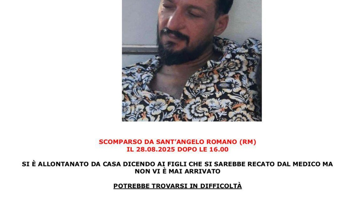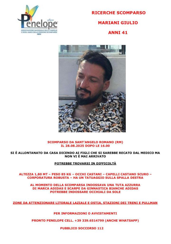 Sono in corso le ricerche di Giulio Mariani, 41 anni, scomparso il 28 agosto 2025 da Sant’Angelo Romano dopo le ore 16. L’uomo si sarebbe allontanato da casa dicendo ai figli che si stava recando dal medico, ma non vi è mai arrivato.