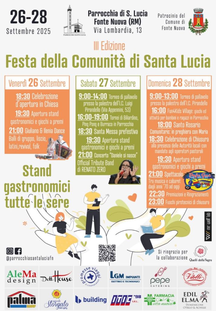 Torna con la sua terza edizione la Festa della Comunità di Santa Lucia, in programma dal 26 al 28 settembre 2025 a Fonte Nuova, presso la Parrocchia di Santa Lucia (via Lombardia, 13). Un appuntamento atteso, che unisce momenti religiosi, conviviali e ricreativi, e che quest’anno promette ancora più partecipazione, emozione e spirito di fraternità.
