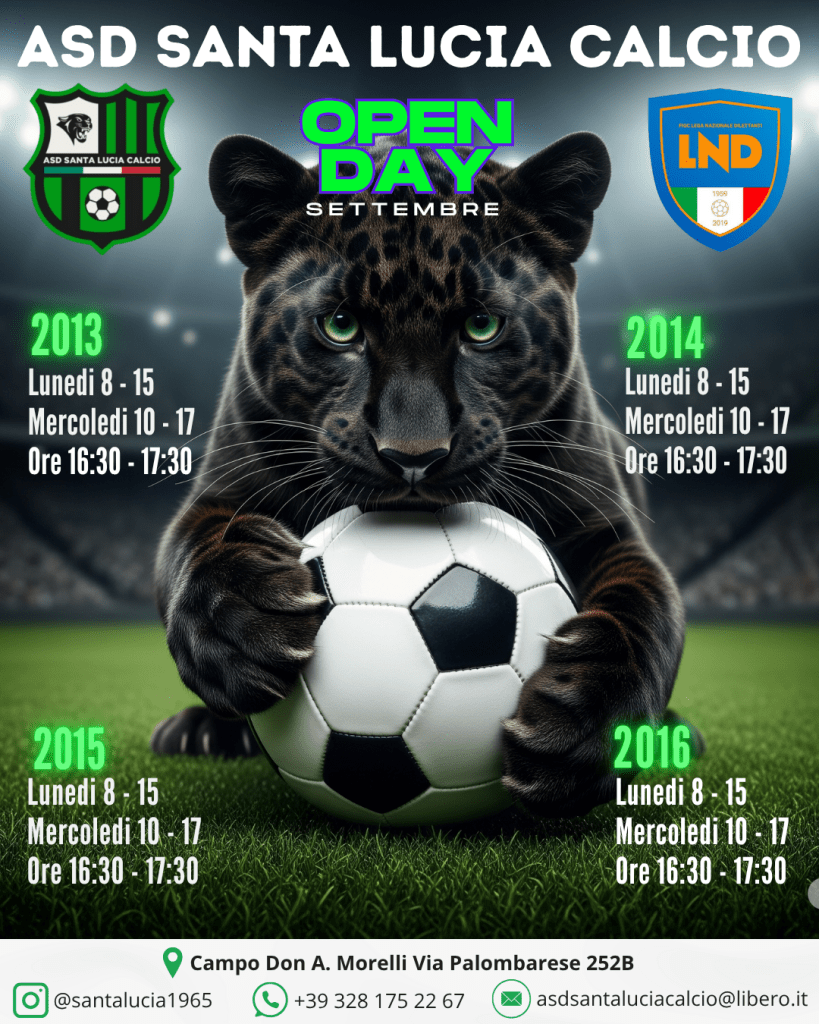 Il fischio d’inizio è vicino e l’emozione è già nell’aria! L’ASD Santa Lucia Calcio è pronta a ripartire e apre le porte a tutti i giovani atleti per i suoi Open Day di Settembre. Un’occasione imperdibile per vivere il calcio con passione, divertimento e professionalità.