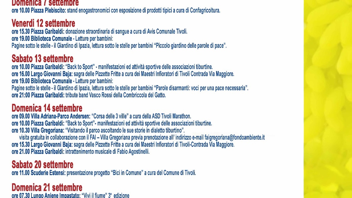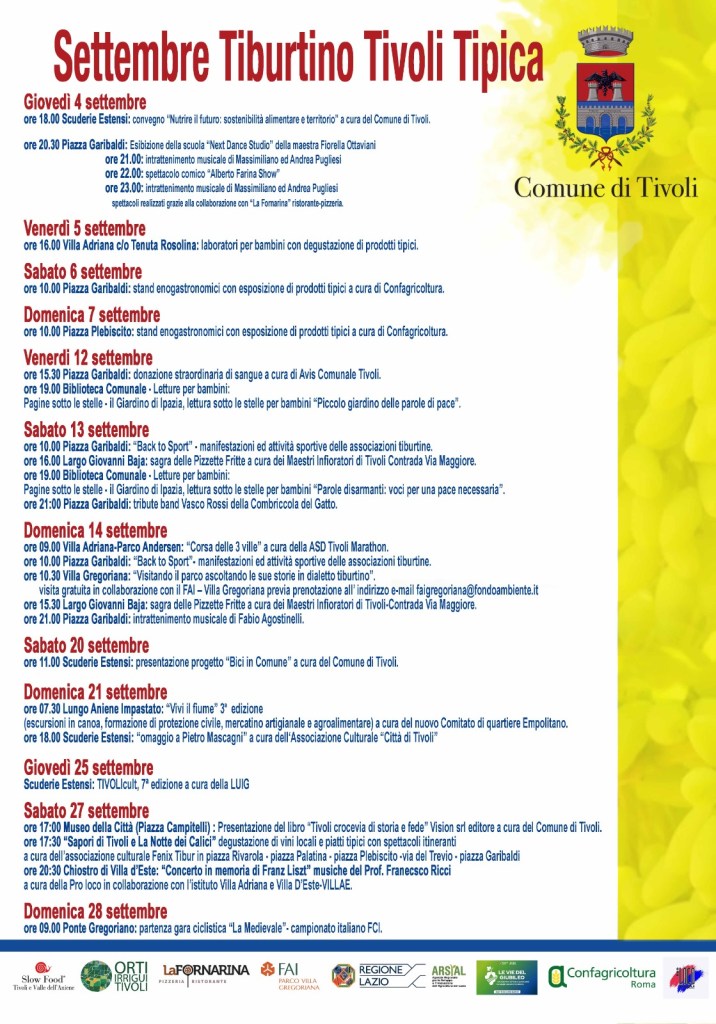 Il gusto sarà protagonista con i weekend enogastronomici a cura di Confagricoltura e con le pizze fritte e i prodotti tipici dei Maestri Infioratori locali. Lo sport avrà il suo spazio con la corsa podistica “3 Ville” e le attività di “Back to Sport”, organizzate dalle associazioni sportive tiburtine.