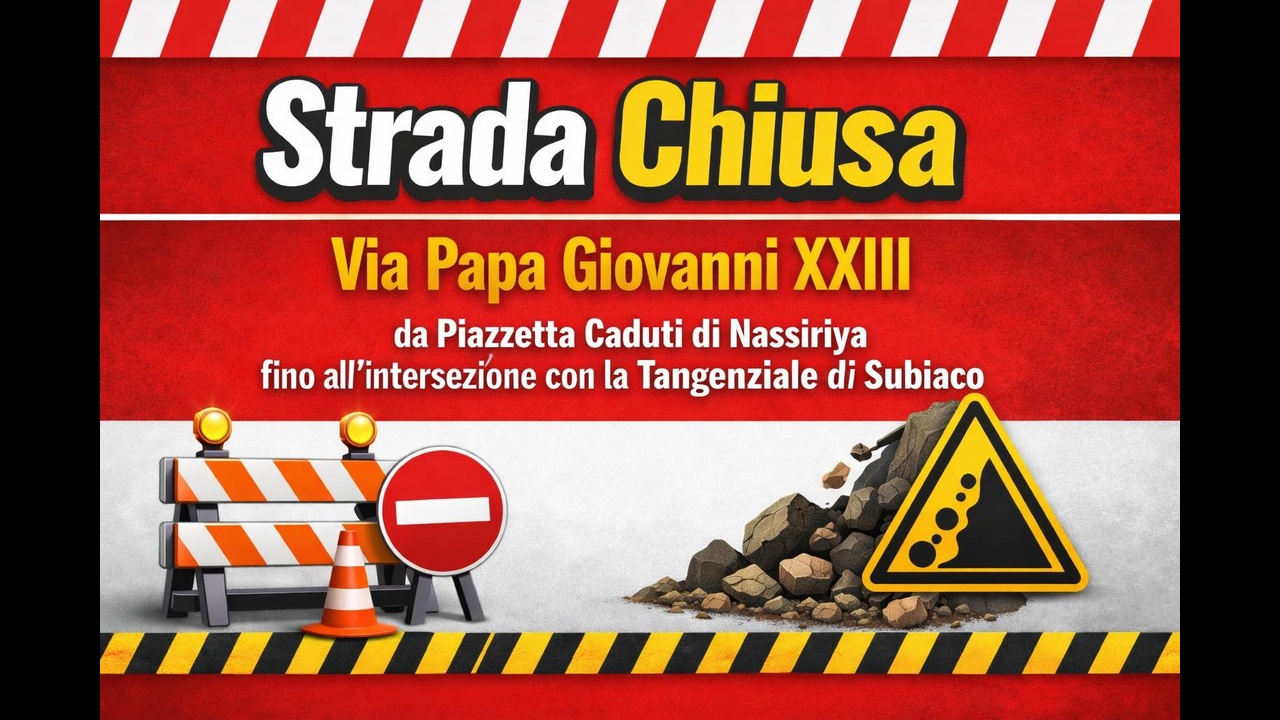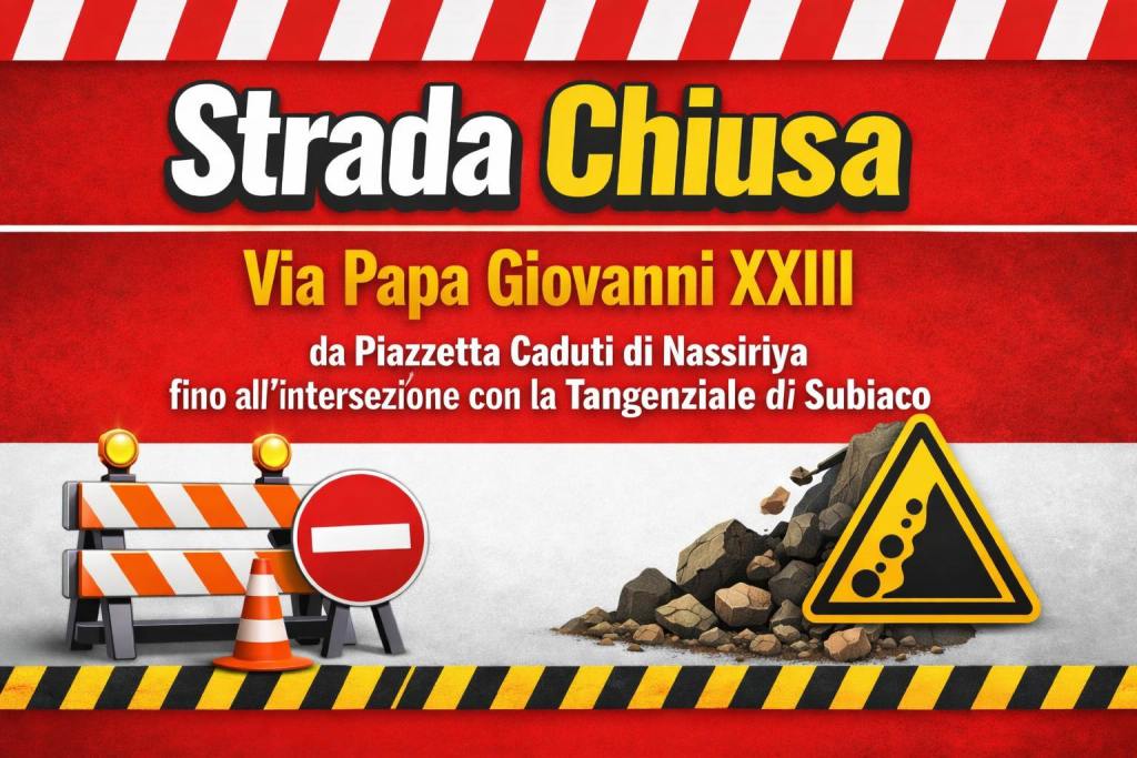 A Subiaco è stata disposta la chiusura temporanea al transito di Via Papa Giovanni XXIII a seguito di una frana verificatasi nella giornata odierna. Il provvedimento è stato adottato con ordinanza sindacale per garantire la sicurezza e la tutela della pubblica incolumità.