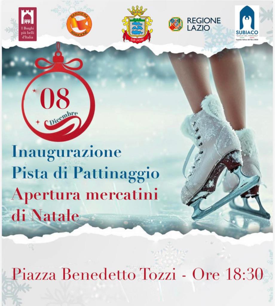La Città di Subiaco invita la cittadinanza all’inaugurazione ufficiale della pista di pattinaggio sul ghiaccio, prevista per lunedì 8 dicembre 2025 alle ore 18:30, in concomitanza con l’apertura del Mercatino di Natale.