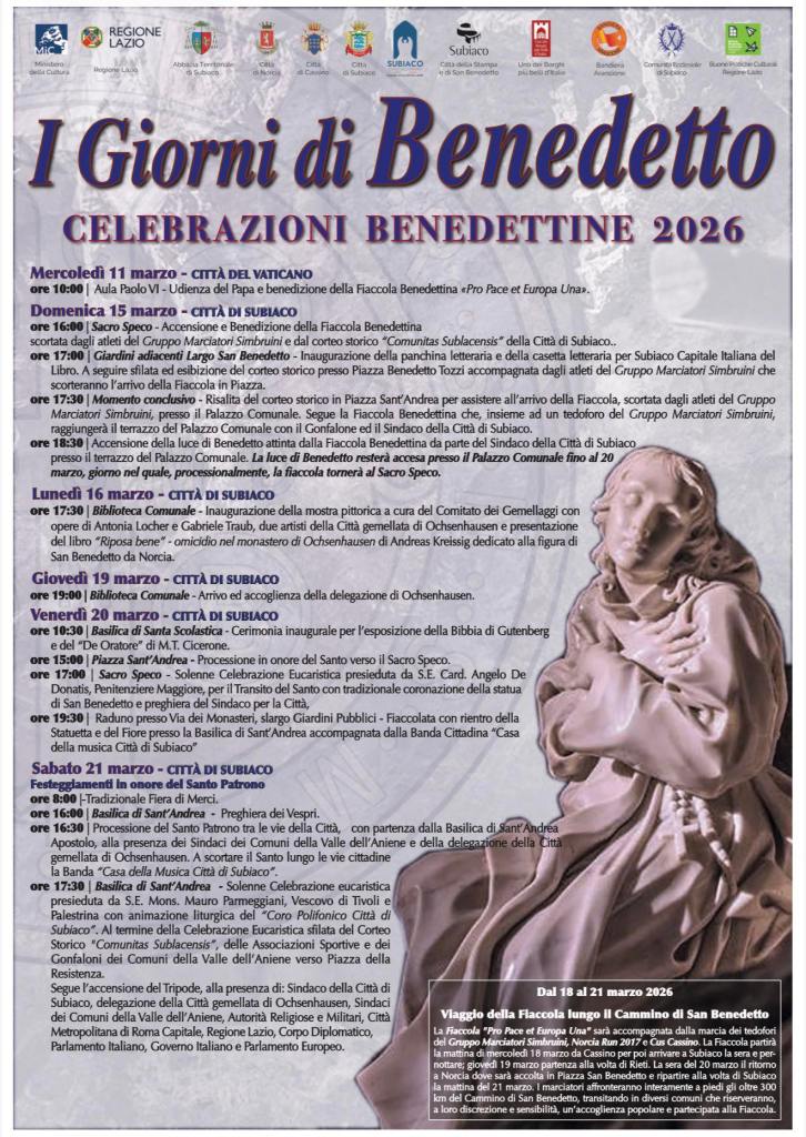 La Città di Subiaco si prepara a celebrare uno degli appuntamenti più significativi della tradizione locale: “I Giorni di Benedetto – Celebrazioni Benedettine 2026”, una serie di eventi dedicati alla figura di San Benedetto, patrono d’Europa e simbolo della spiritualità benedettina.