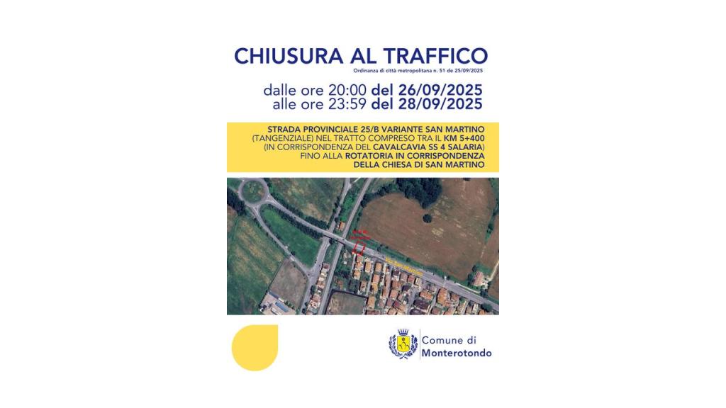 Monterotondo, chiusure stradali per lavori dall’1 al 4 ottobre Il Comune di Monterotondo ha emesso l’Ordinanza Dirigenziale n. 195 del...