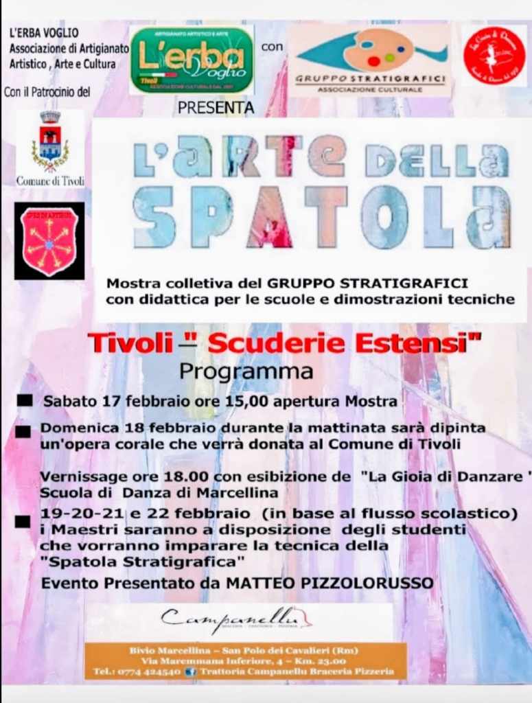 Domenica 18 Febbraio, un’opportunità straordinaria attende gli amanti dell’arte e della cultura presso le Scuderie Estensi di Tivoli. A partire dalle 10.00 del mattino, talentuosi spatolisti si riuniranno per creare un’opera corale destinata al Comune di Tivoli, con l’intento di arricchire il patrimonio artistico locale.