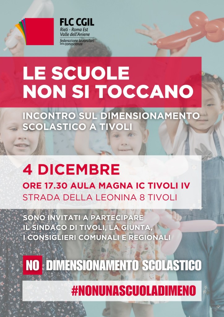 Mercoledì 4 dicembre si terrà nell’aula magna dell’Ic Tivoli 4 una iniziativa promossa dalla nostra organizzazione alla quale abbiamo invitato tutto il consiglio comunale, la giunta, il sindaco, i consiglieri regionali, nonché la cittadinanza e ovviamente le lavoratrici e i lavoratori degli istituti scolastici.