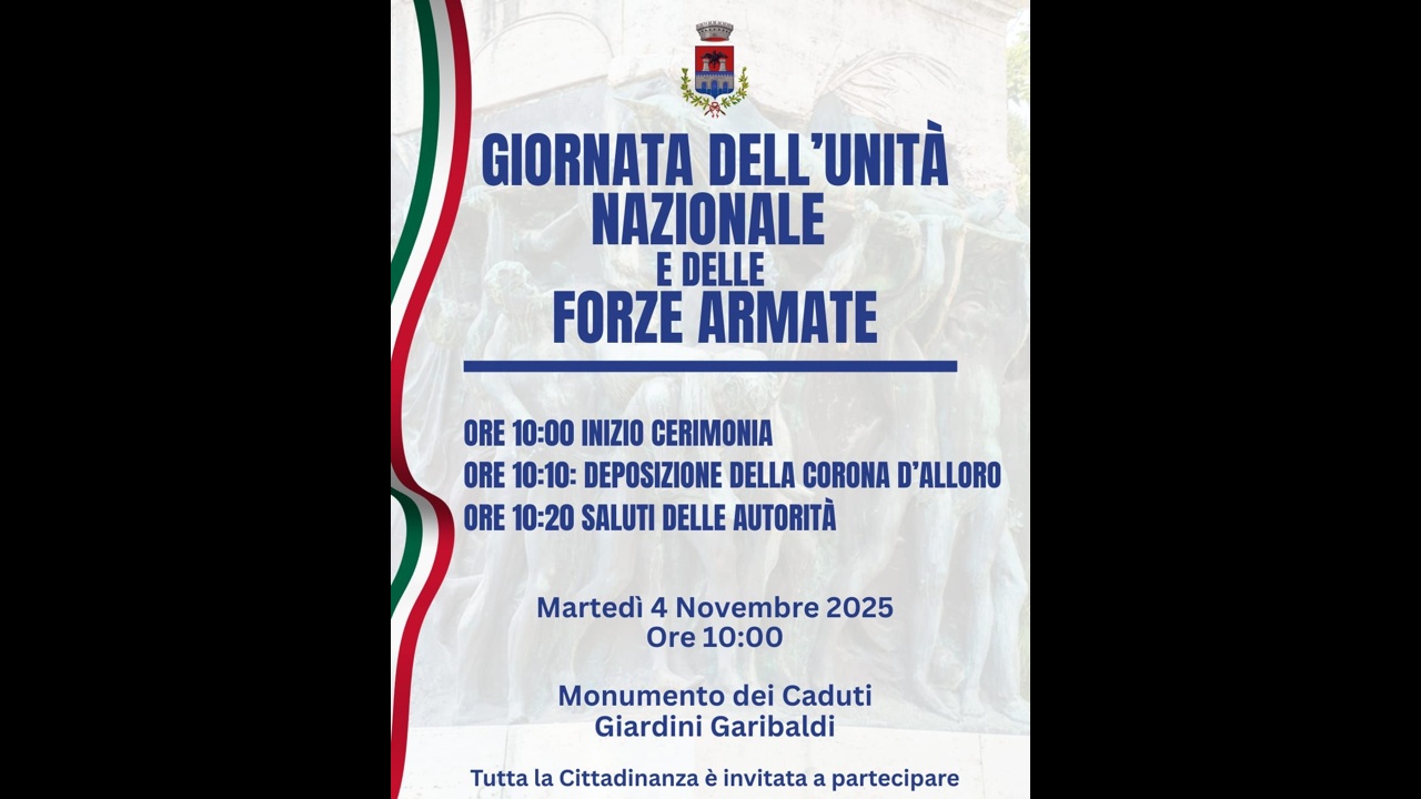 Il Comune di Tivoli invita la cittadinanza a partecipare alla celebrazione della Giornata dell’Unità Nazionale e delle Forze Armate, che si terrà martedì 4 novembre 2025, a partire dalle ore 10:00, presso il Monumento dei Caduti.