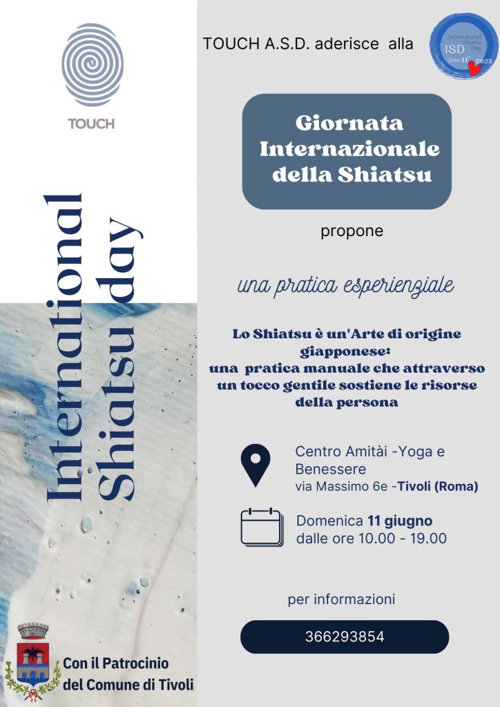 Domenica 11 giugno, in occasione della Giornata Internazionale dello Shiatsu (International Shiatsu Day, ISD), la città di Tivoli ospiterà una giornata speciale di pratica esperienziale offerta da #Touch A.S.D, un’associazione che opera a livello nazionale ed europeo, con particolare attenzione a Tivoli, Roma e Milano.