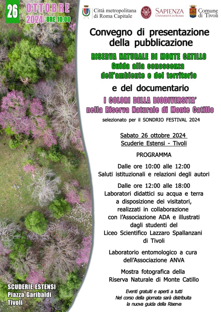 Sabato 26 ottobre 2024, presso le Scuderie Estensi (Piazza Garibaldi, Tivoli), si terrà il Convegno di presentazione della pubblicazione Riserva Naturale di Monte Catillo: guida alla conoscenza dell’ambiente e del territorio, e sarà proiettato il documentario I colori della biodiversità nella Riserva Naturale di Monte Catillo, selezionato per il Sondrio Festival 2024.