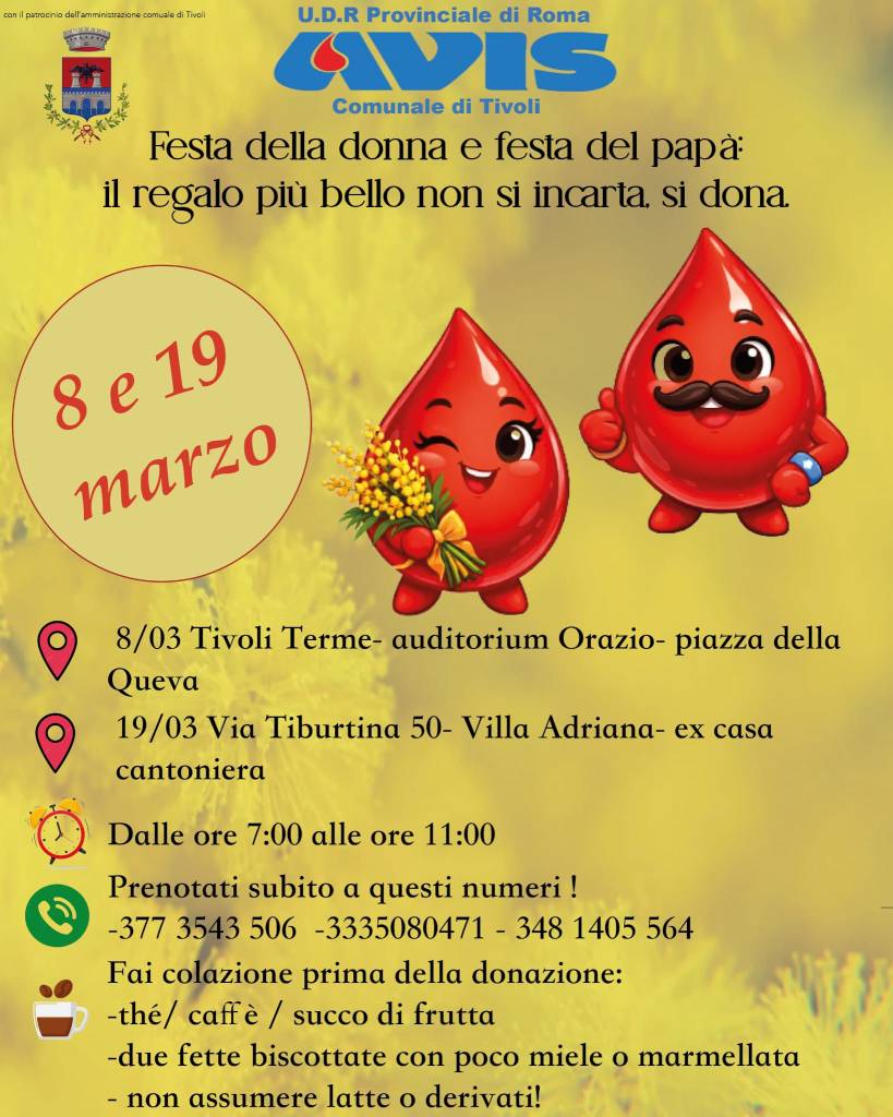In occasione della Festa della Donna e della Festa del Papà, la Città di Tivoli sostiene le giornate di donazione del sangue promosse da AVIS Comunale di Tivoli, rinnovando l’invito alla cittadinanza a compiere un gesto concreto di solidarietà.