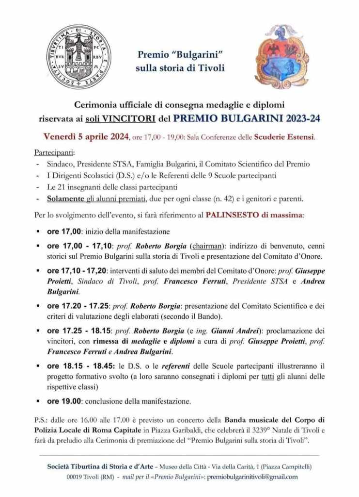 L’inaugurazione ufficiale vedrà la partecipazione della Banda musicale della Polizia Locale di Roma Capitale, che si esibirà in un concerto emozionante in piazza Garibaldi alle ore 16.00. Ma l’evento più atteso sarà sicuramente la cerimonia di conferimento del prestigioso Premio “Francesco Bulgarini sulla storia di Tivoli”.
