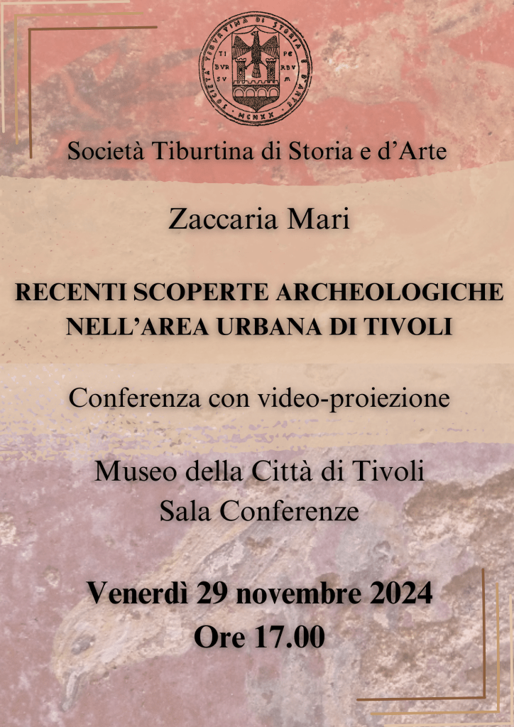La Società Tiburtina di Storia e d’Arte organizza un interessante appuntamento per gli appassionati di archeologia e storia locale. Venerdì 29 novembre 2024, alle ore 17:00, presso la Sala Conferenze del Museo della Città di Tivoli, si terrà la conferenza con video-proiezione intitolata “Recenti scoperte archeologiche nell’area urbana di Tivoli”, a cura di Zaccaria Mari.