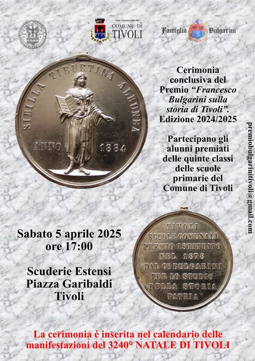 Il 5 aprile 2025, nell’ambito delle celebrazioni per il 3240° Natale di Tivoli, si terrà la premiazione del Premio Bulgarini, un’importante iniziativa promossa dalla Famiglia Bulgarini con il supporto della Società Tiburtina di Storia e d’Arte.
